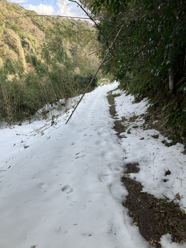 この状況で車で移動すると、最悪の場合、崖下に転落してしまったり立往生する可能性があるので徒歩での移動です。