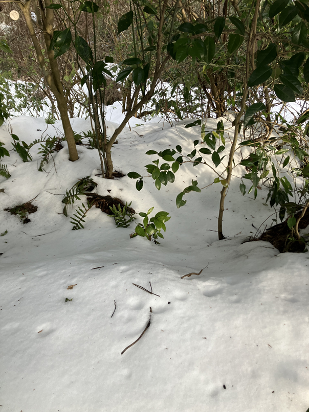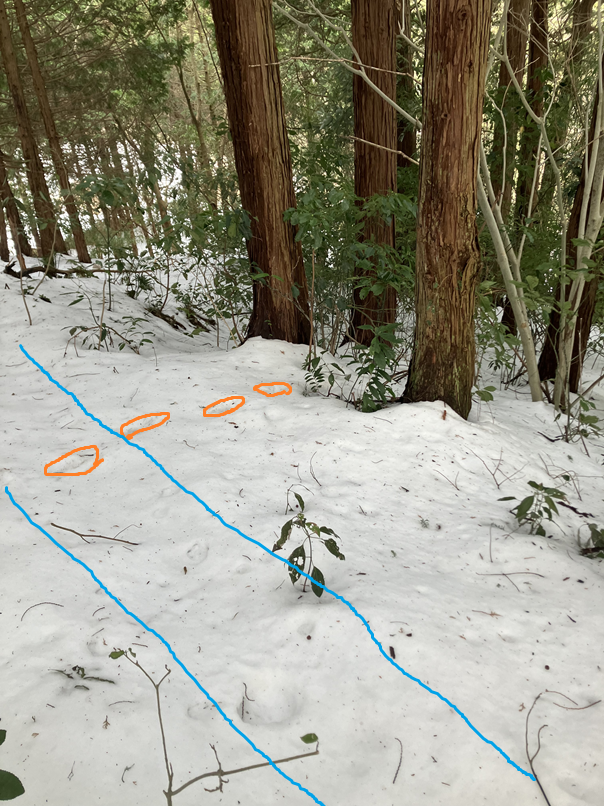 こちらは、いつもはイノシシ、シカが頻繁に通る道ですが、古い足跡のみで新しい足跡はありませんでした。恐らくシカですね…イノシシの気配はありません。