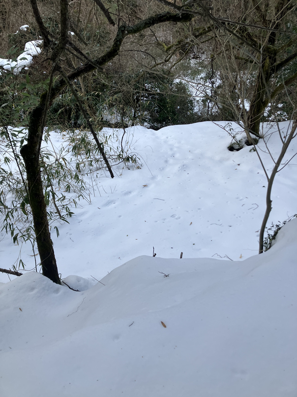 積雪があり、道の路肩も見えない状況でしたので、雪中行軍しました。