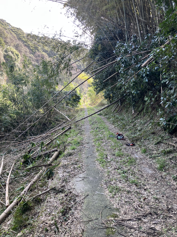 20mおきくらいに孟宗竹やら雑木が倒れているので、それらをチェーンソーでバッサバッサと切り倒し、道の脇によけて通勤路を開拓していきました。