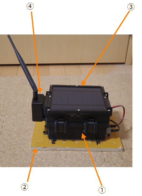 | ③ 太陽光パネル | 箱罠センサー内部のバッテリーを充電するために使用します。1ヶ月も雪に埋もれるような天候でもなければ、バッテリー無交換での運用が可能となります。 |